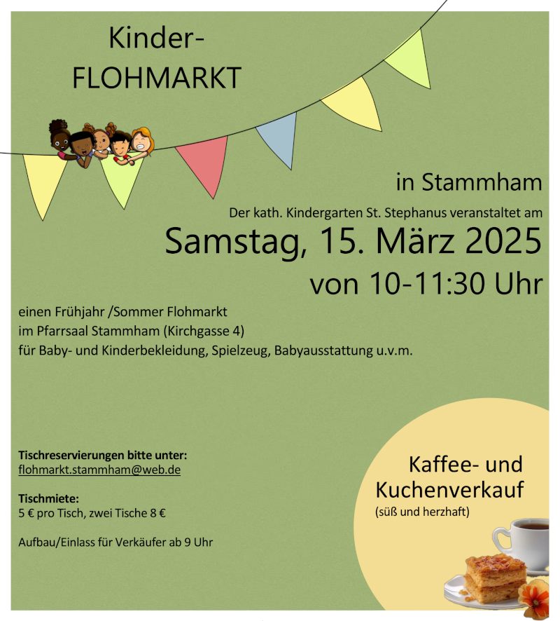 Der kath. Kindergarten St. Stephanus veranstaltet am Samstag, den 15.03.2025 von 10:00-11:30 Uhr einen Frühjahr-/Sommerflohmarkt im Pfarrsaal Stammham (Kirchgasse 4).